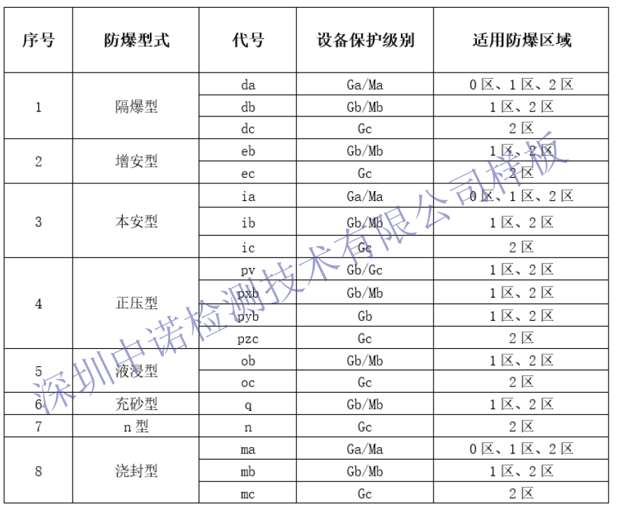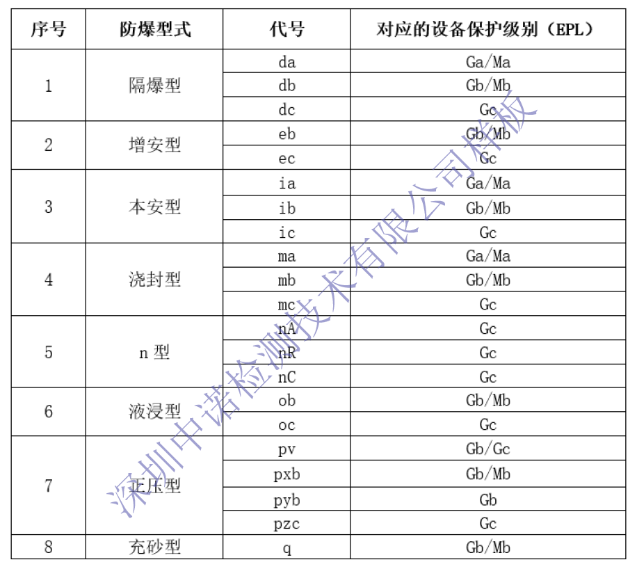 二、防爆保護型式,即設(shè)備采取的防爆保護措施,防爆保護型式以及對應(yīng)的代號關(guān)系見下表。